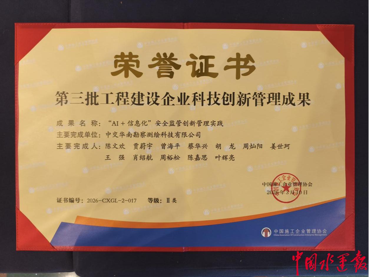 近日,中国施工企业管理协会正式公布第三批工程建设企业科技创新管理成果名单,中交华南勘察测绘科技有限公司公司(以下简称“华南勘测”)申报的《“AI+信息化”安全监管创新管理实践》成果成功入选,并获评Ⅱ类成果。